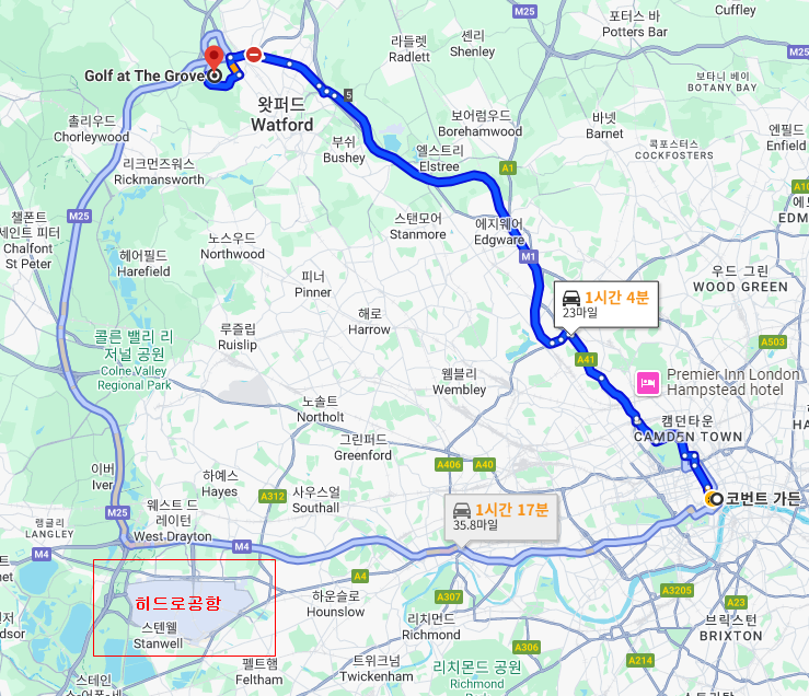 The Grove는 왓퍼드 바로 위쪽에 있어 런던에서 차로 1시간 정도 걸립니다. 저는 이동시 우버를 이용했었는데요 아침 7시, 오후 3시 이렇게 왕복으로 이용했는데 편도로 약 80파운드 정도 나왔습니다. 파운드 환율 1,720원을 생각한다면 적지 않은 돈이지만 대중교통으로 갈 생각 하니 너무 막막해서 편하게 우버로 이동하였습니다.