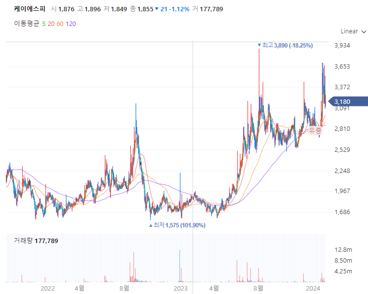 실적 턴어라운드 및 수주잔고 상승으로 저점대비 100% 이상 상승했지만 최근 3,000원대 박스권에 머물러 있습니다. 최근 '23년 4Q 어닝서프라이즈를 보여주면서 3,700원까지 단기 상승했지만 다시 지속적으로 하락하여 다시 박스권으로 회귀하는 모습입니다.